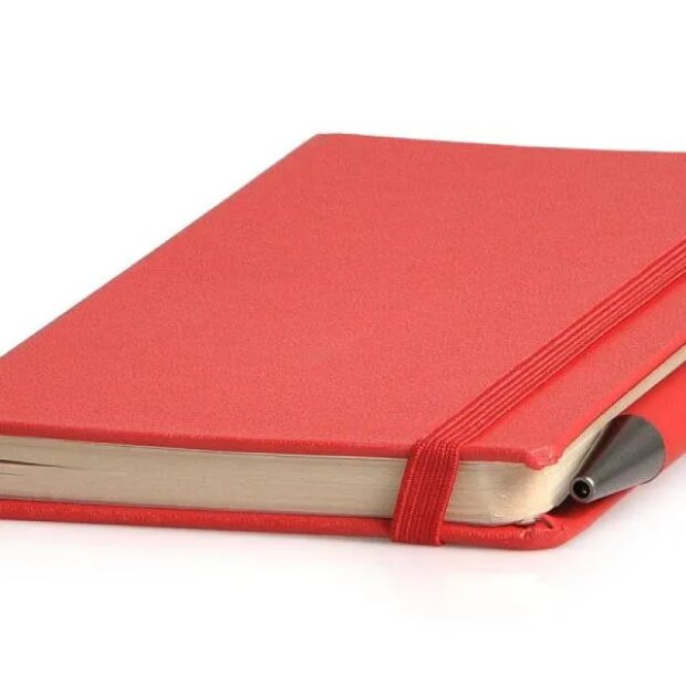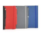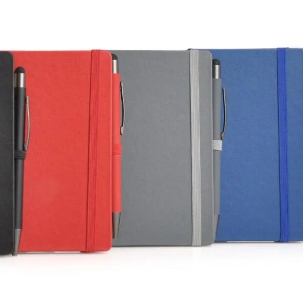 Caderneta para anotações com caneta. A caderneta conta com 80 folhas não pautadas, suporte para caneta e elástico para fechamento. Caneta esferográfica em Alumínio. Conta com acabamento fosco, clipe e ponteira touch em silicone preto. Carga esferográfica azul acionada por um click na extremidade da caneta.