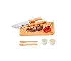 Composto por tábua e duas espátulas de 14 cm em Bambu; dois ramekins em plástico; faca 7″ e garfo em Madeira/Inox.