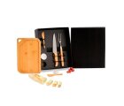 Composto por tábua e duas espátulas de 14 cm em Bambu; dois ramekins em plástico; faca 7″ e garfo em Madeira/Inox.