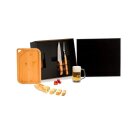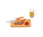 Composto por tábua em Bambu; caneca americano em vidro para Cerveja; faca 7″ e garfo em Madeira/Inox.
