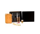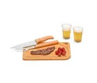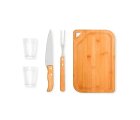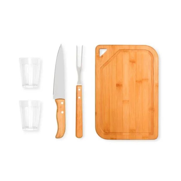 Kit para Churrasco. Composto por tábua em Bambu; dois copos americanos em vidro; faca 7″ e garfo em Madeira/Inox