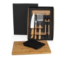 Kit para Churrasco/Hambúrguer. Composto por tábua em Bambu; garfo trinchante, faca 8″, pegador e espátula perfurada em Madeira/Inox. Acompanha também avental em Brim preto.