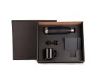 Kit composto por garrafa em aço Inox preta com tampa rosqueável, caneca em cerâmica preta, caderno para anotações preto com capa dura e caneta esferográfica em alumínio preta.
