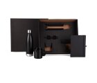 Conta com caderno, garrafa, caneca e caneta na cor preta