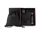Kit composto por mochila sacola em Nylon 420 preta; garrafa em aço inox preta com tampa rosqueável; caneca em cerâmica preta; caderno para anotações wire-o preto com capa dura revestida em percalux linho e caneta esferográfica em ABS preta.