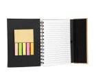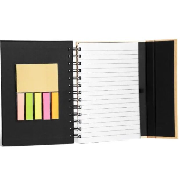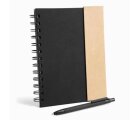 Caderno espiral preto/bege com capa e caneta em Papelão Reciclado rígido, 70 folhas pautadas. Fechamento através de imã na aba.