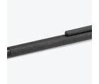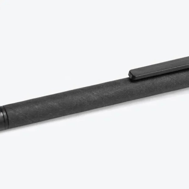 Caneta com ponta touch e carga esferográfica preta, acionada por click.