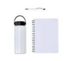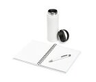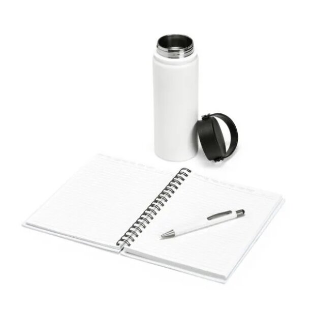 Composto por garrafa em Inox na cor branca, confeccionada com dupla camada; caderno para anotações wire-o branco com capa dura; caneta esferográfica em alumínio branca.