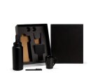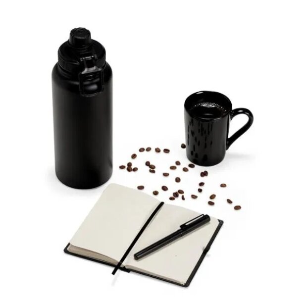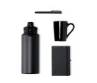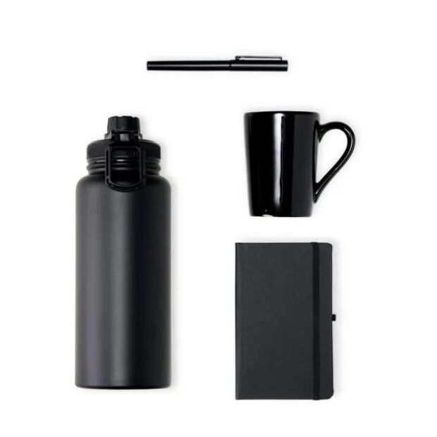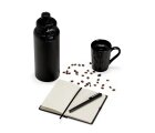 Composto por garrafa em Inox na cor preta, confeccionada com dupla camada; caneca em cerâmica preta; caderno para anotações preto com capa dura e caneta roller em alumínio com tampa preta.