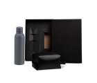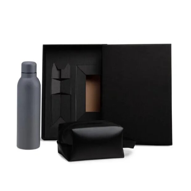 Composto por garrafa cinza, confeccionada com dupla parede em aço Inox e necessaire com alça em material sintético na cor preta.