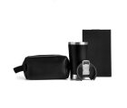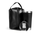 Kit necessaire e copo térmico. Composto por necessaire com alça em material sintético na cor preta e copo térmico com tampa e abridor de garrafa, confeccionado com dupla parede de inox, isolada a vácuo.