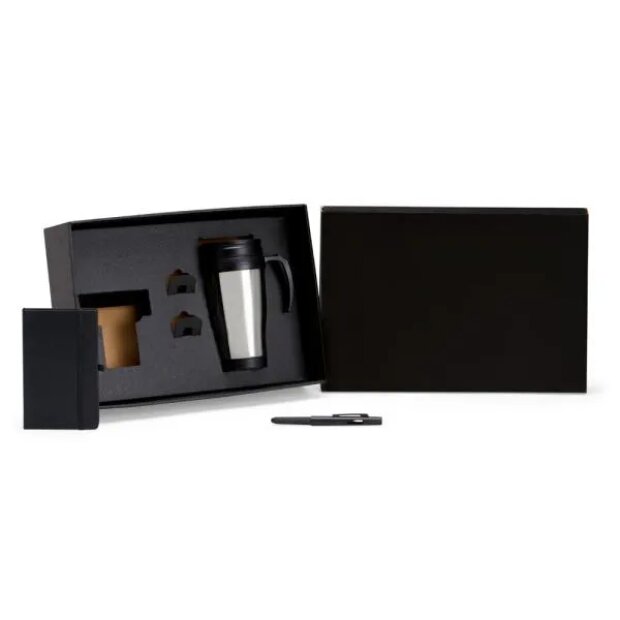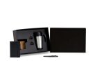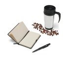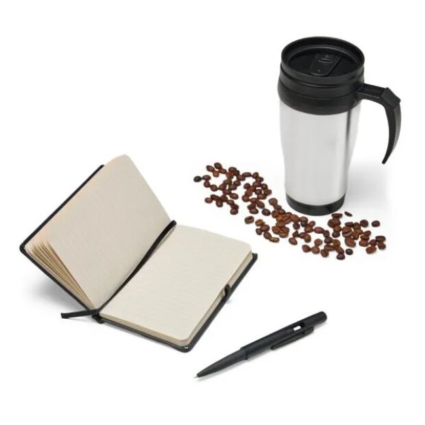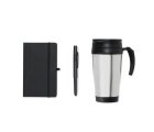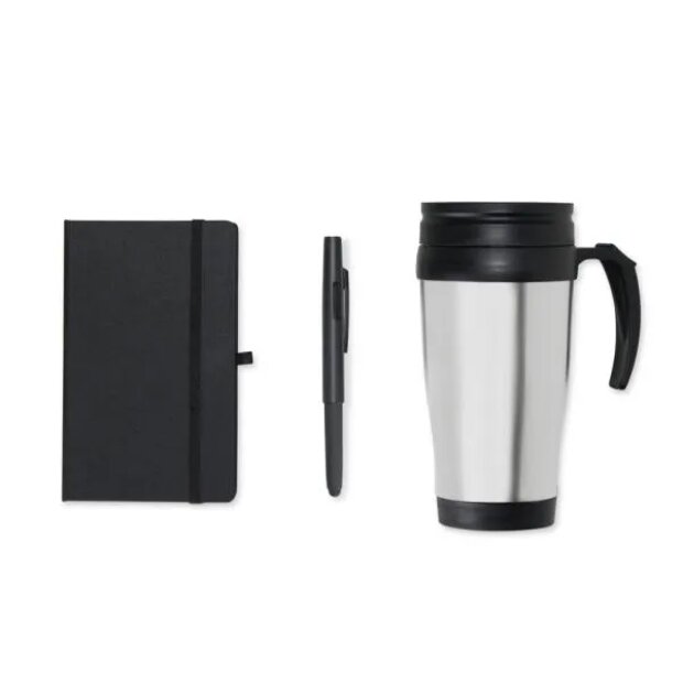 Kit composto por caneca em polipropileno preto revestida em aço inox escovado; caderno para anotações preto com capa dura e caneta esferográfica em ABS preta.