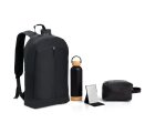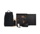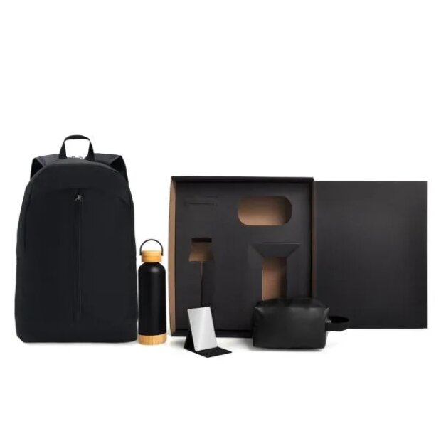 Composto por mochila preta confeccionada em Polyester 600D; necessaire com alça em material sintético na cor preta; garrafa com parede dupla em Inox na cor preta em metal e espelho portátil com acabamento aveludado preto.