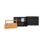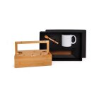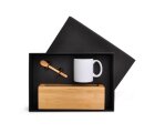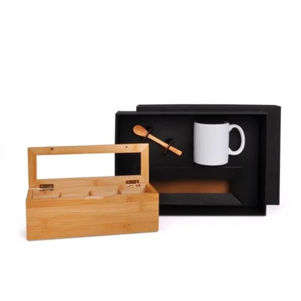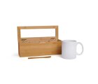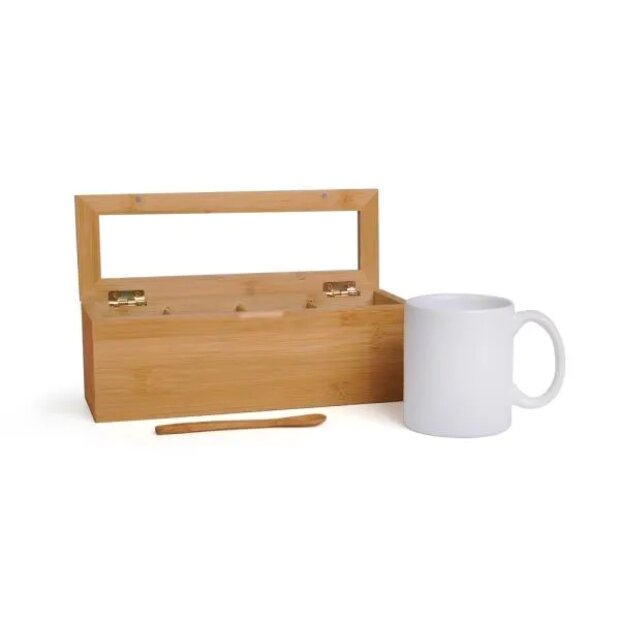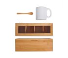 Composto por Caixa para chás em Bambu/Poliestireno; colher de 13 cm em Bambu e caneca em cerâmica branca.