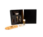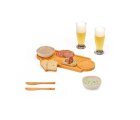 Composto por petisqueira com base em Bambu e dois potes em Fibra de Bambu; dois copos em vidro para Cerveja/Drinks e duas espátulas de 14 cm em Bambu.