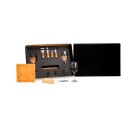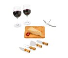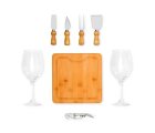 Composto por tábua em Bambu quadrada para Queijo/Petisco; duas facas, sendo, uma com ponta e outra reta, garfo e espátula em Madeira/Inox; duas taças em vidro para Vinho e abridor saca-rolhas em aço Inox escovado.