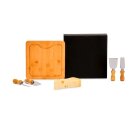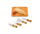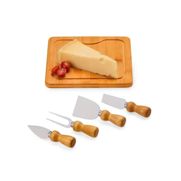 Kit para Queijo. Composto por tábua quadrada em Bambu; duas facas, uma espátula e um garfo em Madeira/Inox para Queijos. Tábua confeccionada com tripla camada invertida, para dar maior durabilidade e não deformar com o passar do tempo.