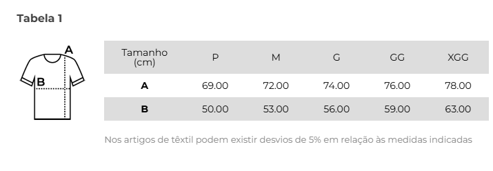 Tamanhos disponíveis: P, M, G, GG e XGG.